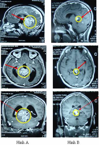 - MRI sọ não có hình ảnh u não vùng tuyến tùng đường kính gần 5 cm, chèn ép cống não gây giãn não thất, phù não nhiều.