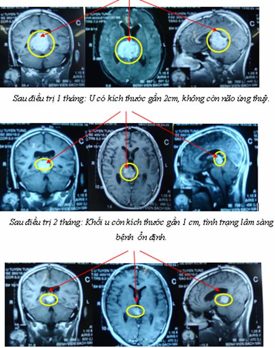 Sau qúa trình xạ trị bệnh nhân cải thiện các triệu chứng lâm sàng rõ rệt: tỉnh hoàn toàn, đỡ đau đầu và thị lực hai mắt hồi phục .Xét nghiệm máu: nồng độ b-hCG là 3,2 mU/ ml, aFP 1,95 ng/ ml. Trên phim MRI sọ não, thể tích khối u tiếp tục giảm theo thời gian.