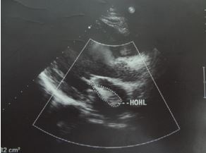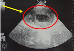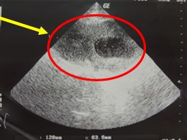 Hình 1. Hình ảnh siêu âm ổ bụng: Khối u vùng hạ vị có hoại tử bên trong |