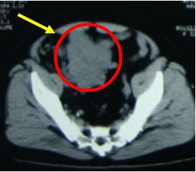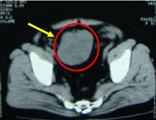 Hình 2. Hình ảnh chụp cắt lớp vi tính ổ bụng: Khối u vùng hạ vị đè một phần vào bàng quang, đẩy bàng quang ra sau và sang trái |