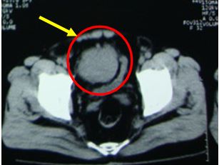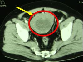 + Bệnh nhân được tiến hành chụp cắt lớp vi tính ổ bụng để đánh giá cho thấy hình ảnh khối giảm tỷ trọng kích thước 70x90x100 mm, ranh giới rõ, bờ thùy múi, ngấm thuốc cản quang sau tiêm, trung tâm có vùng hoại tử không ngấm thuốc, khối u đè đẩy bàng quang ra sau và sang trái