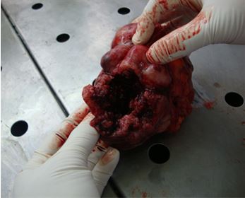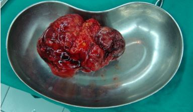 Hình 6. Hình ảnh khối u đã được phẫu thuật cắt bỏ gọn gàng: Khối u vừa được lấy ra, được đựng trong khay. Khối u có kích thước 15x10x10cm |