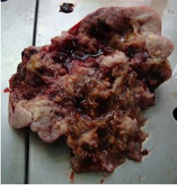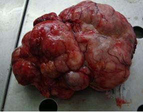 + Đại thể: khối bệnh phẩm đường kính 15x10x10cm; có vỏ bọc ranh giới khá rõ. Diện cắt màu trắng đục, mềm. Trung tâm khối u dạng nang, lồi nham nhở, chứa máu cục.