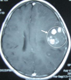Chụp MRI sọ não phát hiện tại thuỳ thái dương trái có 3 khối u kích thước các khối 1,5 x 1,5 cm, ngoài ra còn có các u kích thước nhỏ xung quanh. Hình ảnh MRI gợi ý đến hình ảnh u Lympho não hơn là di căn não. Bệnh nhân được chỉ định mở sọ não lấy u làm giải phẫu bệnh nhưng bệnh nhân đã từ chối phẫu thuật.