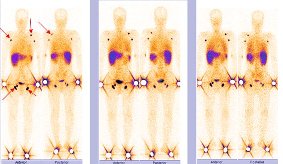 Bàn luận: Trong điều trị ung thư việc xác định đúng giai đoạn bệnh có ý nghĩa quyết định phương pháp điều trị, từ đó mang lại hiệu quả điều trị tốt nhất cho người bệnh. Nếu chỉ dùng các phương pháp chẩn đoán thông thường rất dễ bỏ sót tổn thương qua đó đánh giá không đúng giai đoạn bệnh. Sự ra đời của các máy SPECT, PET, SPECT/CT, PET/CT ghi hình ở mức độ tế bào, mức độ phân tử, theo nguyên tắc chuyển hoá khi chưa có sự thay đổi về giải phẫu thực sự, là bước tiến quan trọng trong việc phân loại đúng, sớm giai đoạn bệnh cũng như việc điều trị ung thư. ở BN này, bằng các kỹ thuật chẩn đoán thông thường (ngay cả với CT 64 dãy đầu dò) đều cho kết quả hoàn toàn bình thường, nhưng khi dùng kỹ thuật xạ hình bằng máy SPECT đã phát hiện ổ di căn xương trên xạ hình xương thì thái độ điều trị đã hoàn toàn thay đổi. BN được tiếp tục điều trị hoá chất và chống huỷ xương, hiện tại bệnh nhân khoẻ mạnh, bệnh ổn định.