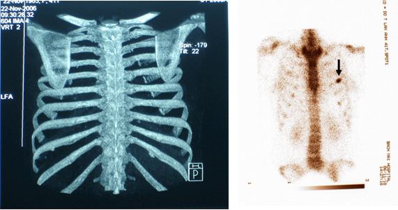 BN được chỉ định làm xạ hình xương toàn thân để kiểm tra tổng thể toàn bộ hệ thống xương, phát hiện ổ di căn xương sườn số 4 trái.