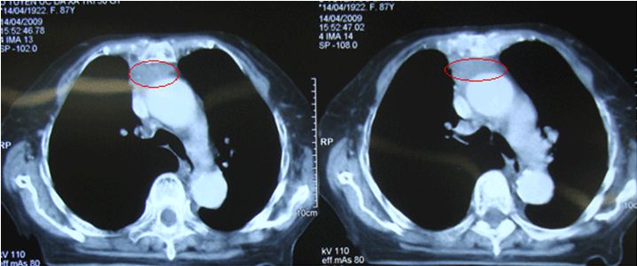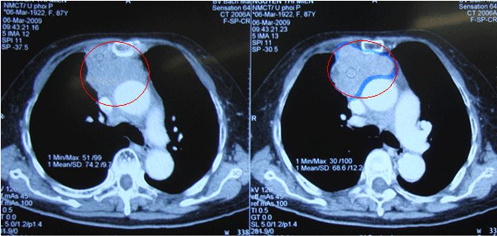 | Khối u tuyến ức | Khối u kích thước 63x48 mm ở trung thất trước trên, lệch sang phải, ngấm thuốc mạnh đồng nhất sau tiêm, không thấy vôi hóa hay thành phần mỡ trong khối | Khối vị trí tuyến ức ngấm thuốc cản quang sau tiêm, kích thước 50x30mm | Khối tỷ trọng tổ chức tại vị trí tuyến ức, ngấm thuốc sau tiêm, không thấy vôi hóa, bờ khối không đều, kích thước 38x30 mm |