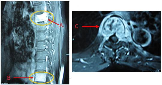 C: Tổn thương đốt sống có xâm lấn tủy sống trên hình ảnh cắt ngang)