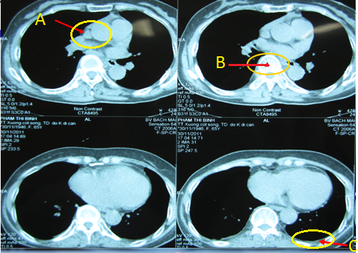 | (Trên hình ảnh CT 64 dãy lồng ngực:(A): Hạch trung thất; (B): Tổn thương đốt sống D7 xâm lấn xung quanh; (C): Dịch màng phổi trái) |