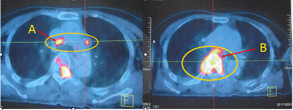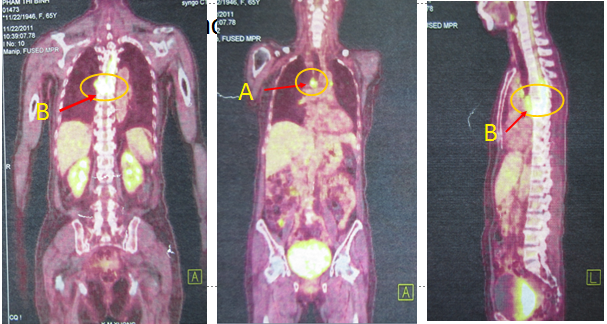 | (Trên hình ảnh PET/CT toàn thân: (A): hạch trung thất; (B): Tổn thương đốt sống có chèn ép tủy sống) |