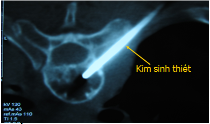 | (Hình ảnh kim sinh thiết xuyên qua đốt sống vào ổ tổn thương) |