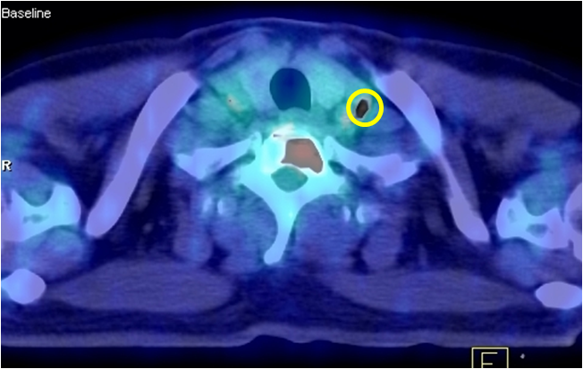 Để chẩn đoán xác định giai đoạn và lập kế hoạch điều trị một cách chính xác hơn, bệnh nhân đã được chỉ định chụp PET/CT (có chỉ định mô phỏng để lập kế hoạch xạ trị).