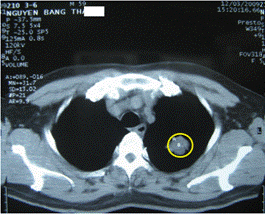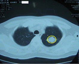 Hình 2: Hình ảnh chụp cắt lớp vi tính (CT) lồng ngực: có khối u phổi trái (trong vòng tròn màu vàng)