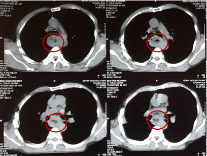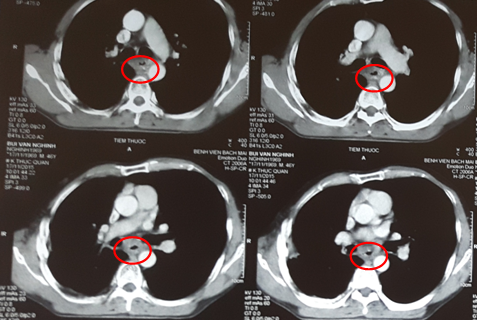 Kết quả chụp cắt lớp vi tính lồng ngực cho thấy: Thực quản đoạn 1/3 giữa dày thành quanh chu vi, không đều, chỗ dày nhất 13 mm, gây hẹp lòng thực quản đoạn dài 50 mm, thâm nhiễm mỡ xung quanh, ôm quanh > ½ chu vi động mạch chủ xuống đoạn ngang mức. Không thấy hình ảnh di căn hạch xung quanh và các cơ quan lân cận.