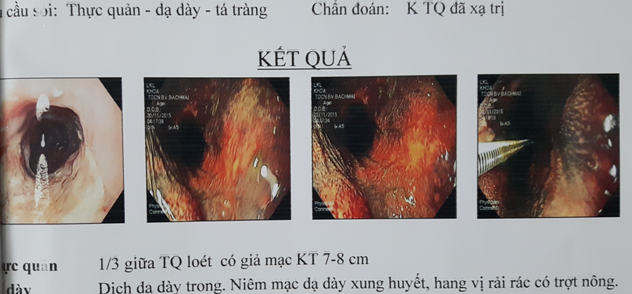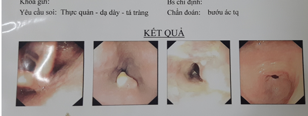 Kết quả nội soi thực quản- dạ dày trước vào viện cho thấy loét sùi, chắc, chiếm gần hết lòng thực quản đoạn 1/3 giữa, ống soi không qua được. Bệnh nhân đã được tiến hành sinh thiết khối u qua nội soi, kết quả mô bệnh học là ung thư biểu mô vảy.