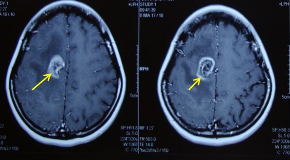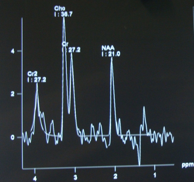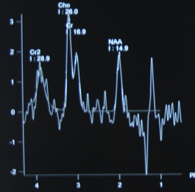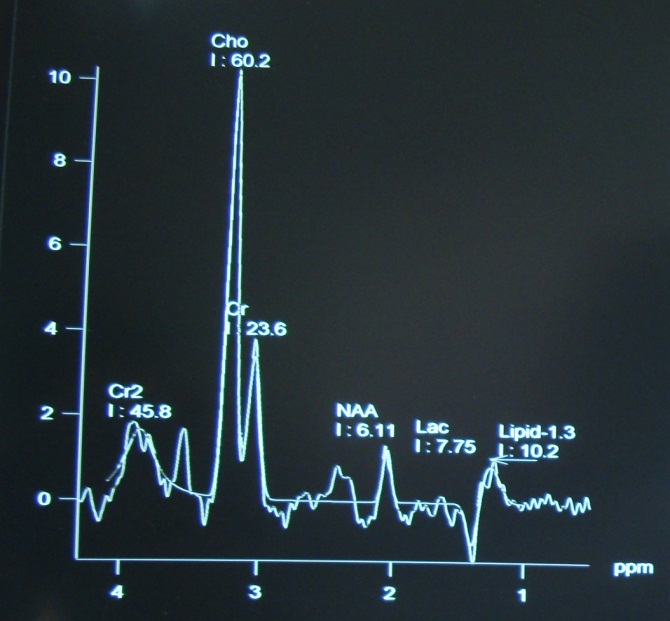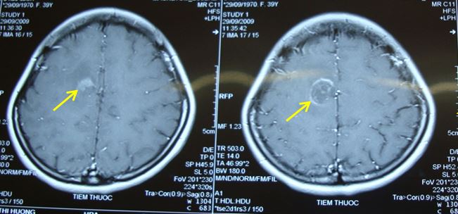 Bệnh nhân đã đến khám tại Bệnh viện Bạch Mai, chụp cộng hưởng từ sọ não phát hiện u não vùng đỉnh phải kích thước 2,5 x 3 cm, có phù não xung quanh và ngấm thuốc mạnh. Trên xung cộng hưởng từ phổ chất chuyển hóa Cholin tăng
