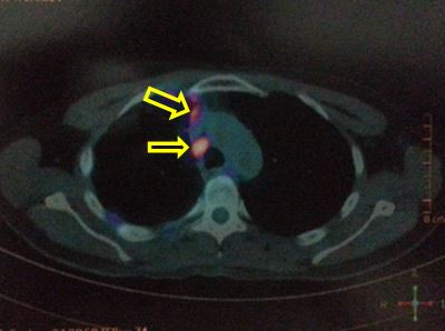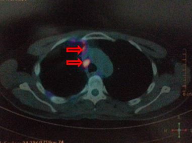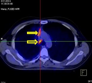 Nhiều nốt mờ rải rác phổi phải, màng phổi, max SUV = 4,7. Hạch cạnh khí quản 1,5 cm, max SUV = 6,4 (đầu mũi tên)