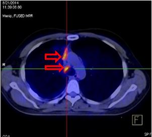 Nhiều nốt mờ dải rác phổi phải, màng phổi, max SUV = 4,25. Hạch cạnh khí quản 1,5 cm, max SUV = 4,93 (đầu mũi tên đỏ)