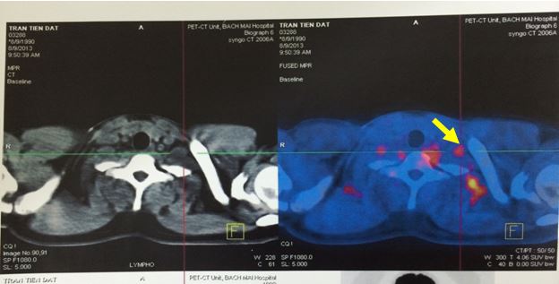 - Trên PET/CT còn tổn thương hạch thượng đòn T 2 cm max SUV 4,3.