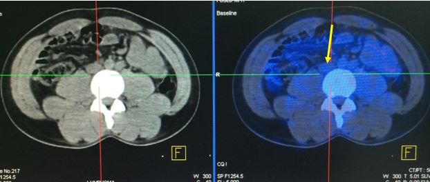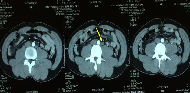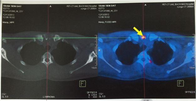 Trên CT ổ bụng có tổn thương hạch cạnh động mạch chủ bụng 1,3cm, nghi ngờ bệnh chưa đáp ứng hoàn toàn hoặc bệnh tiến triển. Bệnh nhân được vào viện chụp PET/CT kiểm tra.