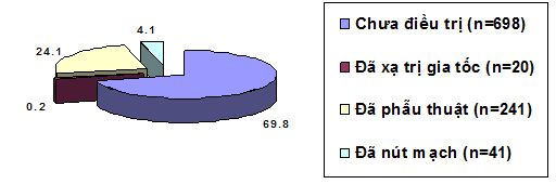 Nhận xét: 69,8% số bệnh nhân chưa được điều trị; 24,1% sau phẫu thuật, 4,1% sau nút mạch và 0,2% bệnh nhân sau xạ trị gia tốc.