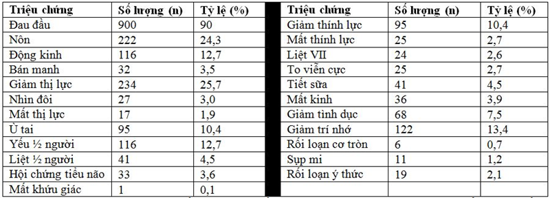 Nhận xét:90% bệnh nhân có biểu hiện đau đầu; 25,7% giảm thị lực; 24,3% có dấu hiệu buồn nôn, nôn; 13,4% giảm trí nhớ; 12,7% động kinh...Các dấu hiệu lâm sàng khác chiếm tỷ lệ ít hơn.