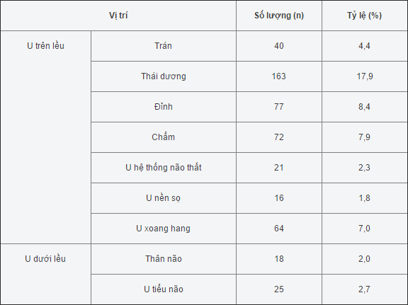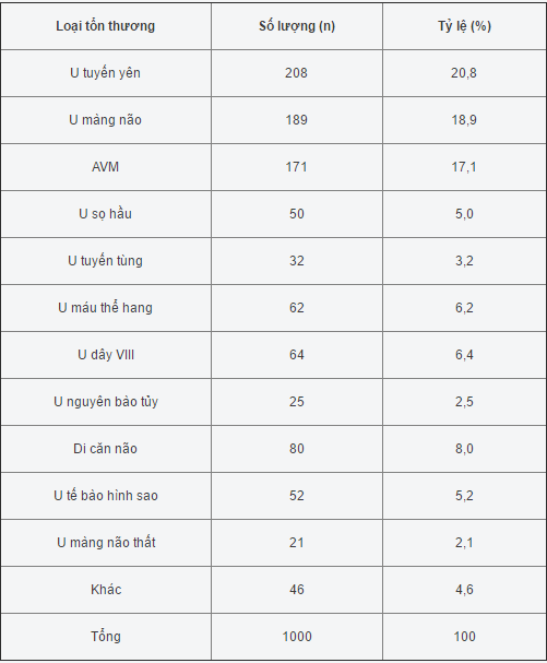 - U tuyến yên chiếm tỷ lệ cao nhất 20,8%, sau đó là u màng não 18,9%, dị dạng mạch não 17,1%, tổn thương não do ung thư di căn chiếm 8,0 %, Các tổn thương khác chiếm tỷ lệ thấp Thường gặp u trên lều, trong đó chủ yếu là thùy thái dương 17,9% sau đó là ở thùy đỉnh và thùy chẩm (lần lượt là 8,4% và 7,9%). U dưới lều chiếm 4,7% trong đó ở thân não chiếm 2%; u tiểu não chiếm 2,7%.