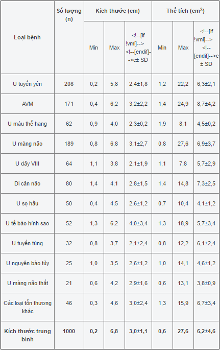 - Kích thước trung bình của tổn thương là 3,0 ± 1,1cm (nhỏ nhất 0,2, cao nhất 6,8 cm), Thể tích u trung bình 6,2 ± 4,6cm³ trong đó thể tích trung bình tổn thương do dị dạng mạch não là cao nhất 8,7 ± 4,2cm³, thấp nhất là u màng não thất chiếm 3,8 ± 0,9cm³, các loại u khác trung bình 6,7±3,4cm³. Liều xạ phẫu từ 8-26 Gy, trong đó cao nhất là carvenoma 18Gy, thấp nhất là u tuyến yên 12,3 Gy.