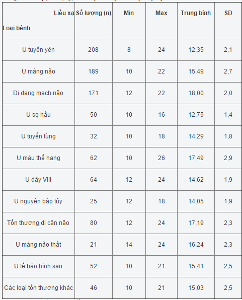 Nhận xét: Liều xạ phẫu trung bình khác nhau tùy theo loại bệnh, cao nhất là dị dạng mạch não 18Gy, thấp nhất là u tuyến yên 12,35 Gy (isodose 50%).