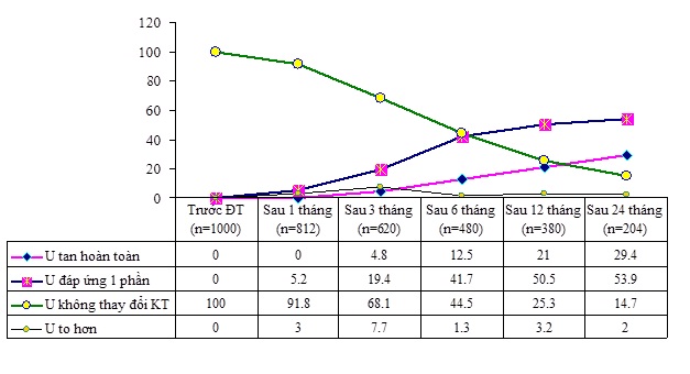 Nhận xét:Sau điều trị 1 tháng: 5,2% u đáp ứng 1 phần; 91,8% u không thay đổi kích thước; 3% kích thước u lớn hơn. Bắt đầu sang tháng thứ 3 u tan hoàn toàn chiếm 4,8%. Tỷ lệ này tăng dần ở tháng thứ 6 chiếm 12,5%; tháng thứ 12 chiếm 21%; đến tháng thứ 24 là 29,4%.