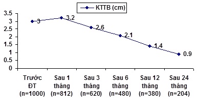 - Kích thước khối u kiểm soát được bắt đầu ở tháng thứ 3 (trung bình 2,6 cm so với trước điều trị là 3.0cm), giảm mạnh dần theo thời gian, cho đến tháng thứ 24 kích thước trung bình là 0,9cm. Trong đó u tan hoàn toàn chiếm 4,8% ở tháng thứ 3, tỷ lệ này tăng dần ở tháng thứ 6 chiếm 12,5%; tháng thứ 12 chiếm 21%; đến tháng thứ 24 là 29,4%.
