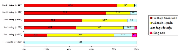 - Các triệu chứng lâm sàng cải thiện dần theo thời gian:. 20,2% hết triệu chứng bệnh ở tháng thứ 1; 46,2% ở tháng thứ 3; 50,2% ở tháng thứ 6; 72,6% ở tháng thứ 12 và 82,4% ở tháng thứ 24.