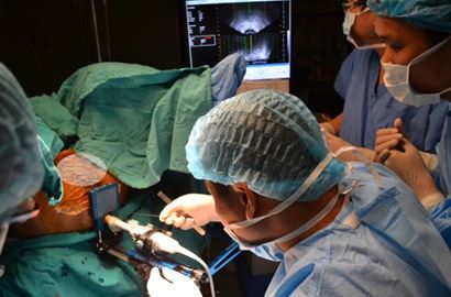 Hình 5: Các Bác sỹ, Kỹ sư Trung tâm YHHN-UB Bạch mai đang tiến hành cấy hạt phóng xạ cho bệnh nhân theo kế hoạch đã lập