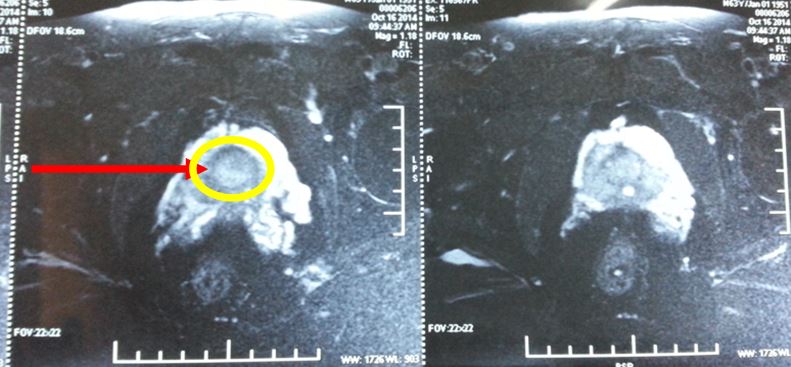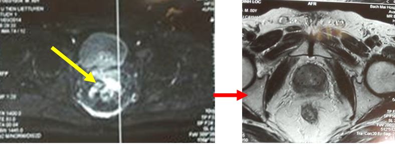 | Trước điều trị: tiểu són, tiểu nhiều lần; trên cộng hưởng từ khối u kích thước 12 x 15 mm, ranh giới không rõ, chưa xâm lấn vỏ bao và túi tinh; PSA = 2,4 ng/ml | Sau điều trị 7 tháng: thể trạng tốt, đi tiểu bình thường; trên hình ảnh cộng hưởng từ không có khối bất thường; PSA giảm xuống còn 0,26 ng/ml |