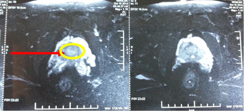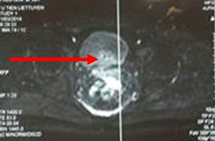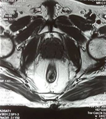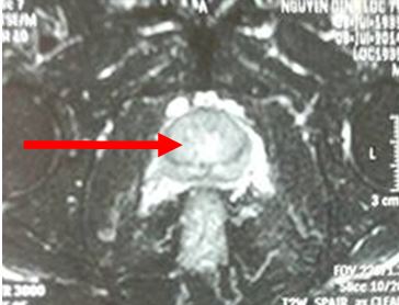 Hình ảnh MRI: khối u tuyến tiền liệt ranh giới không rõ, ngấm thuốc sau tiêm, kích thước 12 x 15 mm, chưa xâm lấn vỏ bao và túi tinh