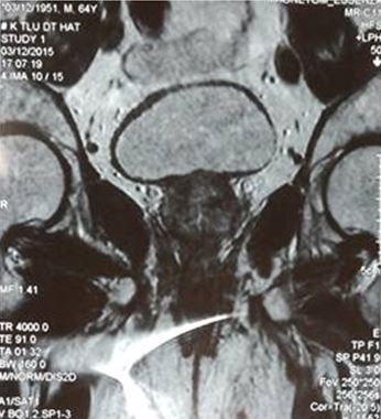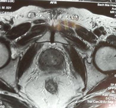 Trên hình ảnh MRI, khối u tuyến tiền liệt ranh giới rõ, bắt thuốc mạnh, kích thước 15 mm, chưa xâm lấn vỏ bao và túi tinh 2 bên.