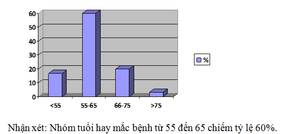 Nhận xét: Tỷ lệ nam bị bệnh nhiều hơn nữ, tỷ lệ là 3,3:1. Độ tuổi trung bình hay gặp là 60 tuổi.
