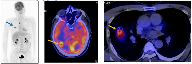 Hình 2: khối u ác tính phổi phải di căn hạch, di căn não (mũi tên). Giải phẫu bệnh sau chụp PET/CT là ung thư biểu mô tuyến.