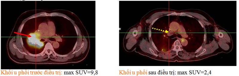 Ca lâm sàng 3: bệnh nhân nam, 58 tuổi, chẩn đoán ung thư phổi T4N1M0, sau xạ trị và hóa chất khối u nhỏ hẳn, giảm hấp thu FDG.