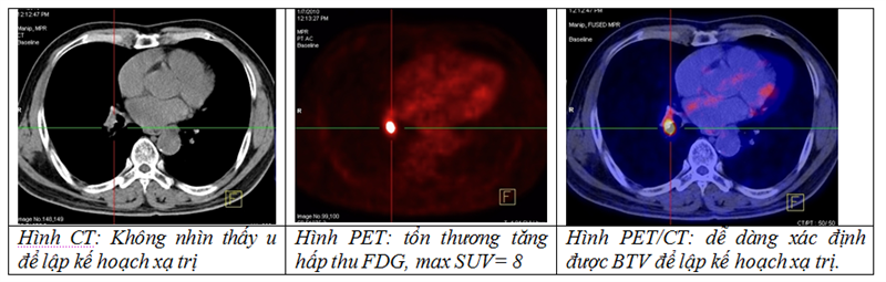Hình 4: Trường hợp một bệnh nhân không xác định được GTV trên CT, nhờ PET/CT xác định được BTV.