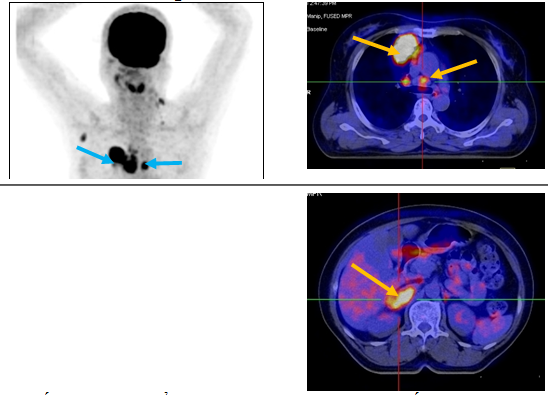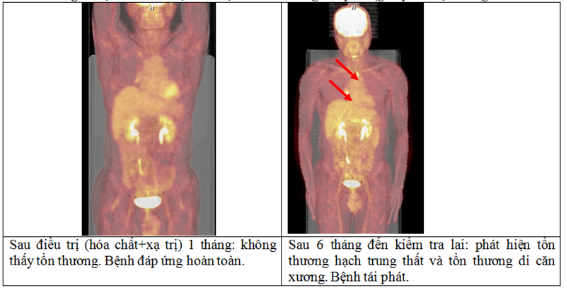 2. PET/CT giúp phát hiện được các tổn thương di căn, nhiều nhất là vào hạch trung thất (50%), xương (26,7%), não (23,3%), hạch thượng đòn (20%), di căn phổi (10%), gan (3,3%), tuyến thượng thận (6,7%).