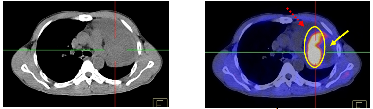 Hình 6. Trên CT thông thường không phân biệt được rõ ràng tổ chức u, vùng xẹp phổi. Trên hình PET/CT giúp phân biệt rõ tổ chức u (vùng sáng màu), vùng xẹp phổi (mũi tên đứt nét) và vùng hoại tử (mũi tên liền), chỉ điểm cho việc sinh thiết u làm giải phẫu bệnh cũng như xác định thể tích đích trong lập kế hoạch xạ trị.