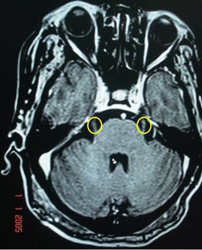 Trên hình ảnh MRI sọ não cắt qua cầu não, xung T1, hình ảnh dây thần kinh số 5( Dây thần kinh sinh ba) hai bên rất rõ |