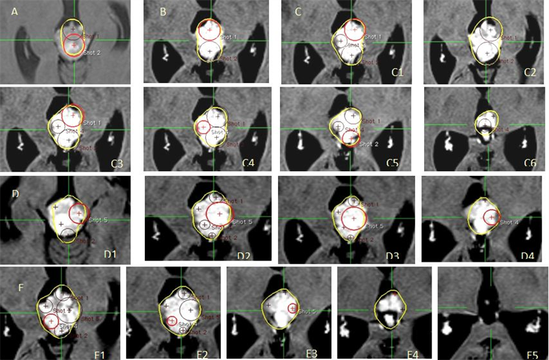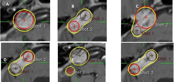 Chú thích: Các ví dụ về các hình elip và quả tạ. (A) Đường đồng liều 50% (vàng) của shot đơn 8 mm. (B) Một shot 8mm thứ hai được đặt gần để tạo ra một đường đồng liều có hình elip. (C) Một hình elip không đồng tâm dạng quả lê có thể được tạo ra nếu shot thứ hai lớn hơn (trong trường hợp này là shot 14 mm). (D) Một shot 8 mm thứ hai được đặt xa hơn shot thứ nhất để tạo ra đường đồng liều hình quả tạ. (E) Một shot thứ hai được đặt xa hơn shot thứ nhất nhằm mục đích tạo ra một “thanh” dài hơn của quả tạ nhưng sự tái chuẩn hóa lại tạo thành hai hình tròn. (F) Một shot nhỏ hơn có trọng số thấp hơn được sử dụng như một “shot tăng cường” để kết nối hai đường đồng liều (shot thứ ba là một shot 4 mm với trọng số 0.33).