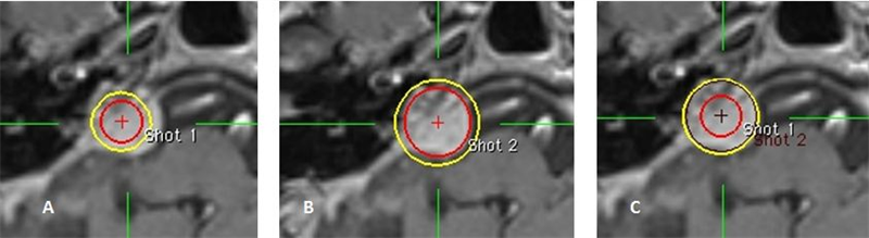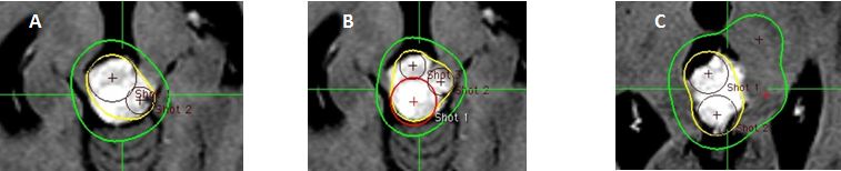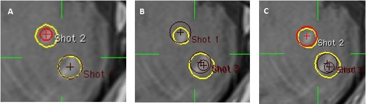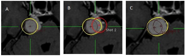 Hình 19: Hình (A) Đường đồng liều (vàng) của shot đơn này không bao phủ được khối u và bao gồm cả mô lành. Hình (B) Shot nên được dịch về tâm khối u nhưng lại quá nhỏ để phủ toàn bộ khối u. Thay vào đó, một shot thứ hai được chọn để bao gồm cả mô lành ở phía bên kia của khối u (màu đỏ) nhằm mục đích sử dụng sự tái chuẩn hóa để “kéo” shot đầu tiên về đường giữa và tạo ra độ bao phủ khối u tốt hơn. Hình (C) Kết quả kế hoạch có độ phù hợp tốt.