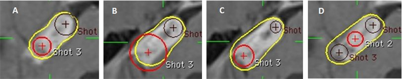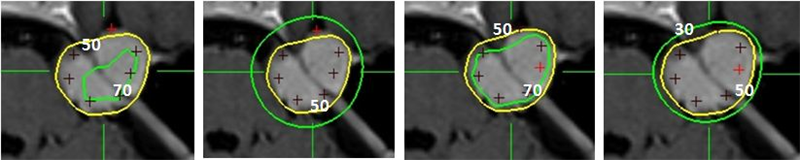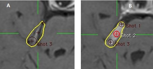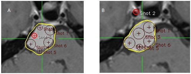 Hình 18: Hình (A) Các shot 14mm được đặt đối xứng xung quanh khối u để tạo thành một đường đồng liều 50% (vàng) khi băt đầu lập kế hoạch. Điểm trung tâm của mỗi shot được đánh dấu bằng các vòng tròn đỏ. (B) Bởi vì số lượng và sự đối xứng của các shot, một sự thay đổi nhỏ trong vị trí và trọng số cho phép tạo ra một kế hoạch phù hợp.
