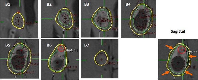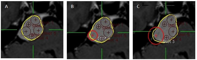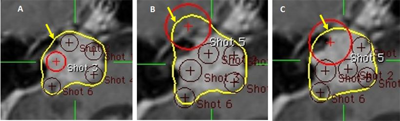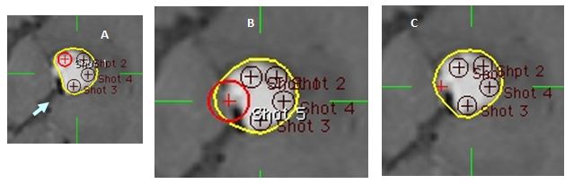 Hình 14: Hình (A) Lát cắt mặt phẳng dọc giữa của kế hoạch cho thấy đường đồng liều 50% (vàng) không bao phủ cực trên khối u (mũi tên). (B) Shot được thêm vào trung tâm khối u. (C) Giá trị z của shot thêm vào ở B điều chỉnh kế hoạch bao phủ cực trên khối u.