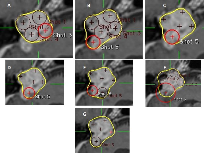 Hình 10: Hình ảnh phép dựng hình ngón tay. (A) Phần tròn của khối u được bao phủ bởi đường đồng liều 50% (màu vàng). (B) Shot được đặt để bao phủ phần kéo dài hình ngón tay ở một bên. Các đường đồng liều quá rộng (C). Trọng số của shot được giảm xuống nhưng đường đồng liều “ngón tay” vẫn quá rộng ở các đoạn góc của nó. (D) Shot được dịch sang bên để giảm độ rộng của ngón tay. (E) Shot thứ hai được đặt để bao phủ đầu ngón tay. Đường đồng liều quá rộng. (F) Shot được đặt sang bên để giảm độ rộng đầu mút ngón tay. (G) Điều chỉnh nhỏ ở trọng số và vị trí của shot đầu tiên để tăng độ tương thích.