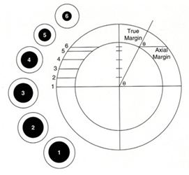 Hình 13: Mặt phẳng của kế hoạch xạ phẫu thường kết hợp chặt chẽ các đường viền – đó là những khoảng cách nhỏ giữa ranh giới của khối u với đường đồng liều điều trị. Hình vẽ này cho thấy sự so sánh của các đường viền cần thiết trên các lát cắt riêng biệt để tạo ra các đường viền thật sự quanh khối u. Vòng tròn lớn thể hiện lát cắt coronal (mặt phẳng trên) của khối u. Phần đường viền được đánh dấu “Viền mặt phẳng cắt ngang” chỉ ra độ rộng của đường viền có thể được tạo ra ở một lát cắt ngang tại một vị trí đặc hiệu trên đường viền khối u; phần được đánh dấu “Viền thật sự” chỉ ra viền thật sự ở điểm đó – đó là khoảng cách nhỏ nhất của đường đồng liều với khối u ở vị trí đó. Lưu ý là đường viền mặt phẳng cắt ngang lớn hơn đường viền thật sự và sự khác biệt này thường tăng lên đối với các giá trị góc θ lớn hơn – điều đó dành cho các điểm ở gần cực trên của khối u. Các đường ngang ở phía trái chỉ ra các đường viền cần thiết của 6 lát cắt được chỉ định nhằm mục đích tạo ra đường viền thật sự ở lát cắt 1. Các vòng tròn ở phía trái được vẽ để cân bằng và chỉ ra các kích thước tương đối của các lát cắt khối u (các vòng tròn màu đen) và các bờ (các vòng tròn đen) ở 6 lát cắt được chỉ định. Lưu ý là đường viền yêu cầu gần với cực tại lát cắt 6 lớn hơn một cách đáng kể so với dự kiến.