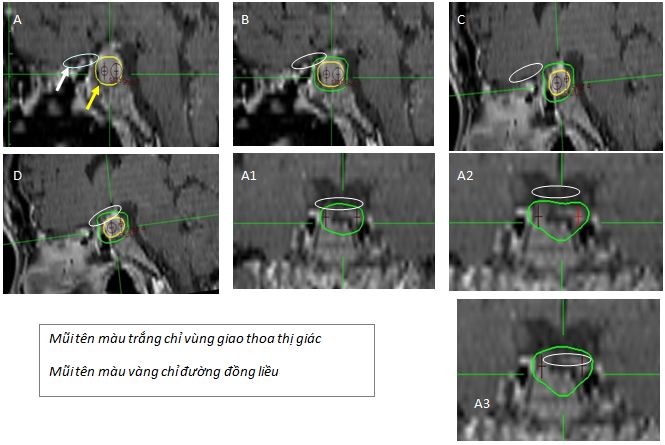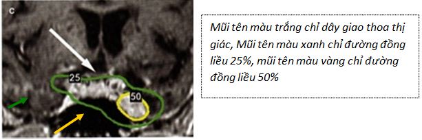 Đường màu vàng chỉ đường đồng liều 50%, hình mũi tên chỉ dây giao thoa thị giác không bị ảnh hưởng bởi đường đồng liều màu xanh 25%